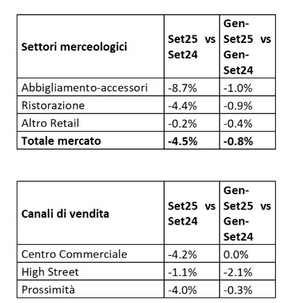 Nei settori merceologici, il mese di settembre registra cali altrettanto preoccupanti con il comparto di abbigliamento-accessori a -8,7%. Svanito l’effetto saldi, che in realtà non è mai veramente partito, si conferma la debolezza di un settore che ha sofferto per tutto l’anno, senza mai registrare progressi significativi. In flessione anche la ristorazione che con un -4,4% conferma le abitudini dei consumatori disposti a spendere sempre meno per gli acquisti voluttuari, ma concentrati ad assorbire gli effetti inflattivi sul carrello della spesa che continua a pesare sul portafoglio. Altro retail (casa-arredo, elettronica, telefonia, libri, cura persona, servizi e fitness) chiude il mese a -0,2%, contenendo in parte la flessione del totale mercato.