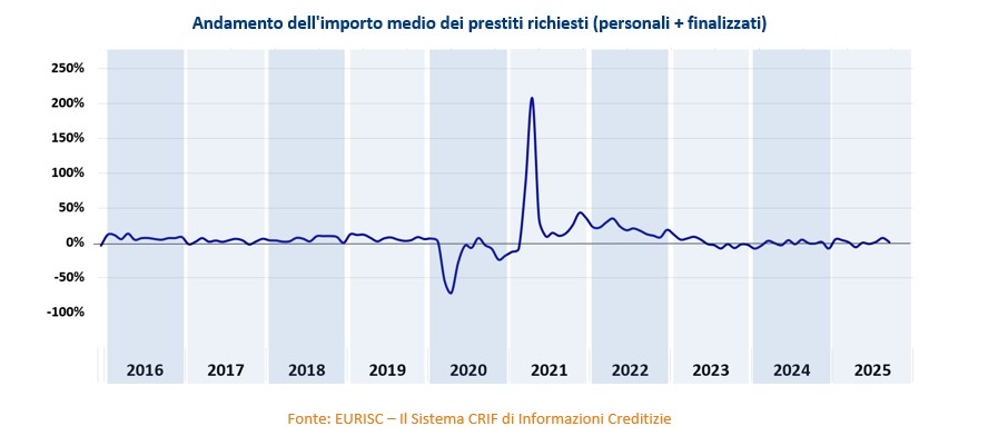 CRIF le richieste di prestiti famigliari nei primi 9 mesi del 2025 rimangono stabili: +0,9% (settembre +0,7%, agosto +6,7%),l'importo medio è di circa 9.900 euro.