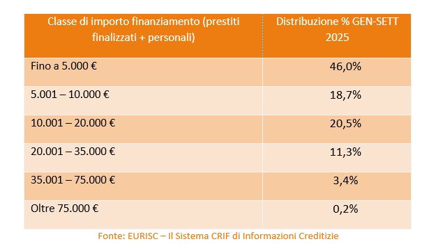 Si registra la stessa prudenza anche per le diverse tipologie di finanziamento: il 61,9% delle richieste di prestiti finalizzati presenta importi al di sotto dei 5.000 euro e la stessa classe d’importo risulta la preferita anche per i prestiti personali con il 33,0% del totale.