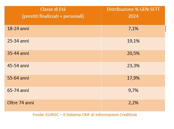 La stessa dinamica si registra sulle diverse tipologie di finanziamento, poiché anche in questo caso la fascia di età più propensa a richiedere finanziamenti rimane quella 45-54 anni: il 23,5% per i prestiti personali e il 23,1% per i prestiti finalizzati.