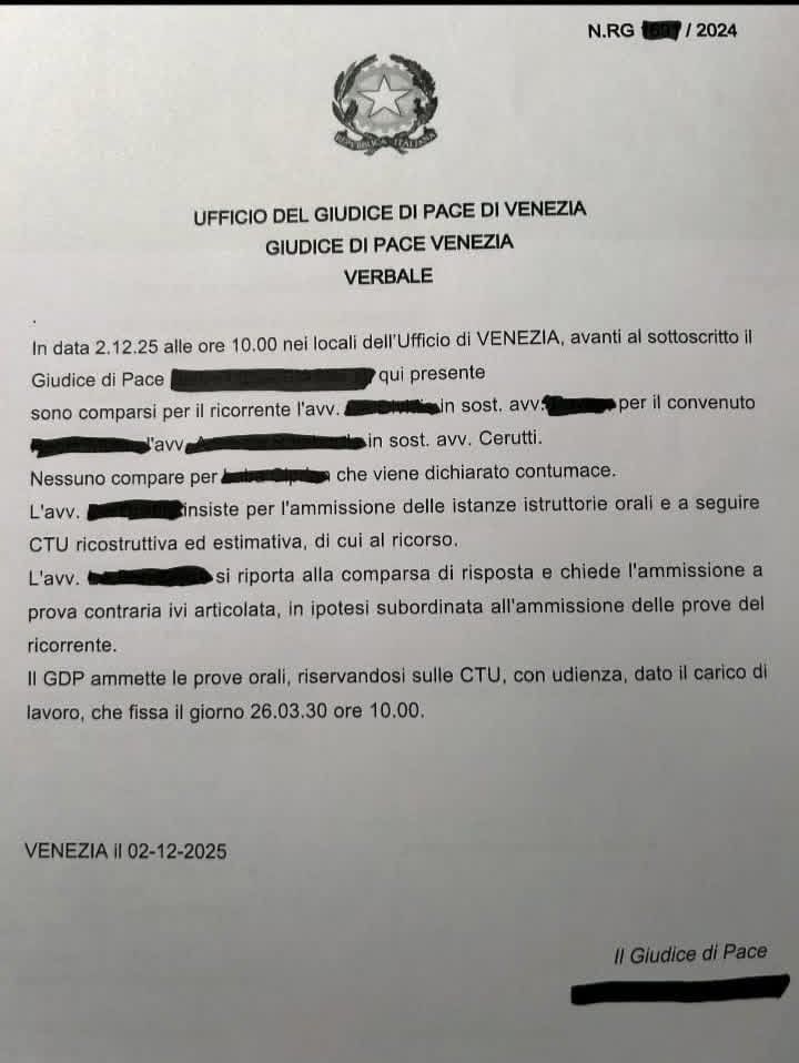 "Il GDP [Giudice di Pace, ndr] ammette le prove orali, riservandosi sulle CTU, con udienza, dato il carico di lavoro, che fissa il giorno 26.03.30 ore 10.00": è quanto si legge a conclusione di un verbale giudiziario emesso dal Giudice di Pace di Venezia lo scorso martedì 2 dicembre.