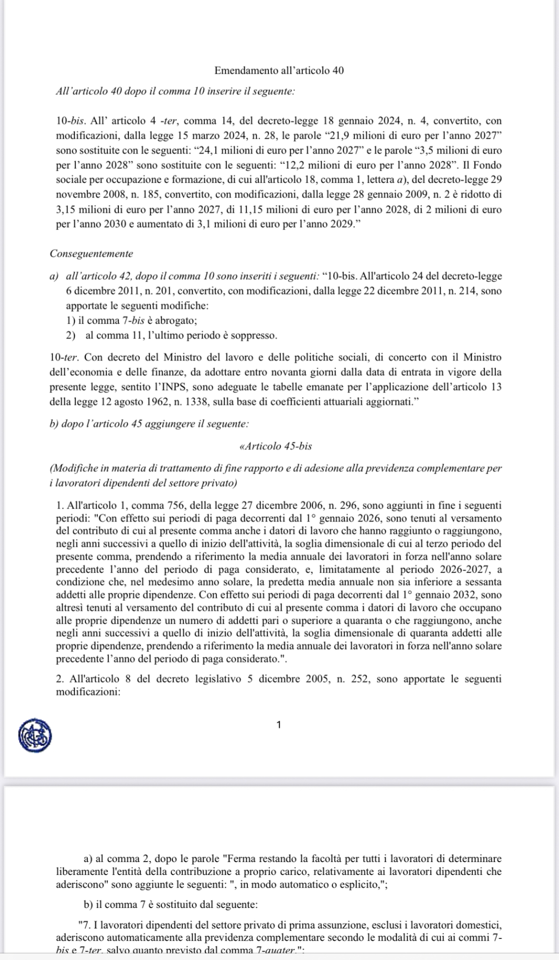 Alla copertura, pari a 140 milioni di euro annui si provvede attraverso la riduzione del Fondo per i farmaci innovativi che pertanto dal 2026, "è rideterminato da 1.300 milioni di euro annui a 1.160 milioni di euro annui". Torna la misura per l'ampliamento dei soggetti tenuti al versamento del Tfr al Fondo Inps per l'erogazione del contributo. Dal primo gennaio dell'anno prossimo è previsto che vi rientrino "anche i datori di lavoro che, negli anni successivi a quello di avvio dell'attività, hanno raggiunto o raggiungano la soglia dimensionale dei 50 dipendenti".