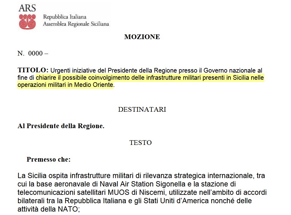 "Al Presidente della Regione Siciliana" è fatto sollecito che "richieda formalmente al Governo italiano e al Consiglio dei Ministri se siano a conoscenza delle attività operative recentemente svolte presso la base di (...) Sigonella e il MUOS di Niscemi". Recita così il primo punto di istanze contenute nella mozione parlamentare depositata da tre deputati firmatari dell'ARS di Palermo contro il Governo della Regione Siciliana alla luce delle evidenze emerse circa il decollo di velivoli e droni Usa da una delle basi militari più importanti della Regione (Sigonella) prima che lo scorso 28 Febbraio scoppiasse la guerra in Medio Oriente. Il Giornale d'Italia è venuto in possesso del documento esclusivo col quale ora Governo siciliano e italiano sono chiamati a rispondere della natura di queste operazioni prebelliche.