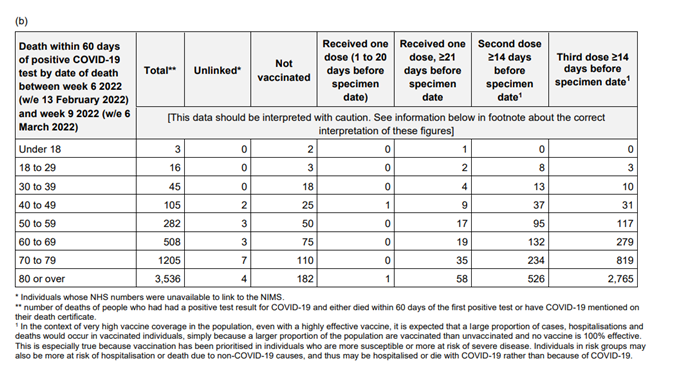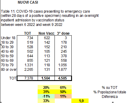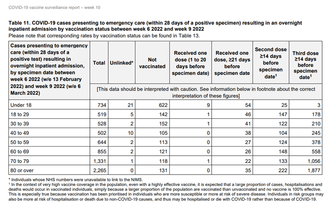 Il decimo rapporto di sorveglianza sul Covid-19 pubblicato il 10 marzo 2022 dalla UK Health Security Agency (corrispondente all’Istituto di Sanità Italiano), fa emergere che su 7.378 nuovi casi di persone ricoverate in Emergency care per Covid negli ultimi 28 giorni, 4.505, ovvero il 61%, sono vaccinate con terza dose, mentre 1.504 sono le persone non vaccinate (il residuo è ovviamente rappresentato da chi ha ricevuto una o due dosi).