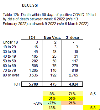 I valori sono ancora più evidenti per i decessi. Nella seconda tabella emerge che negli ultimi 60 giorni ci sono stati 5.700 morti, e di questi circa 4mila (il 71%) avevano ricevuto la terza dose, mentre 475 (ovvero l’8%) non erano vaccinate.