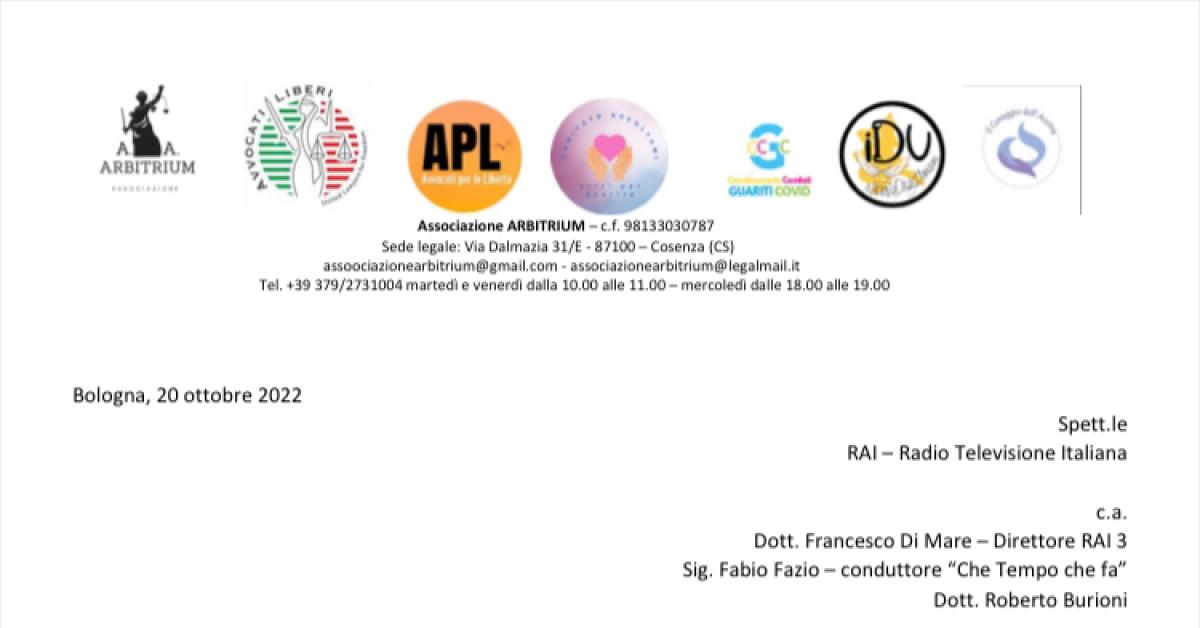 Arriva una lettera di diffida alla Rai, da parte di scienziati e professionisti e associazioni (ARBITRIUM) in replica alle dichiarazioni a dir poco "fantasiose di Burioni". Le parole del virologo, e la sua campagna sulla quarta dose non sono passate inosservate. E la Scienza rappresentata da moltissimi esponenti di valore boccia lo scientismo dogmatico dei televirologi della Rai. Di seguito elencati: