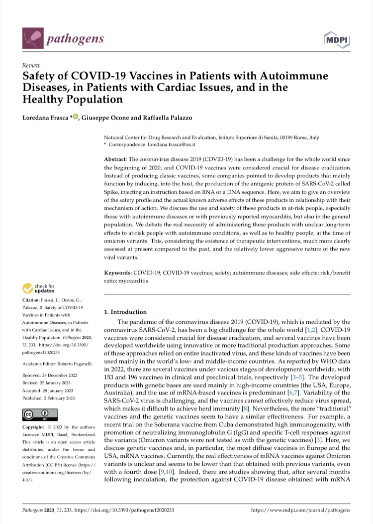 Tre ricercatori dell'ISS, Loredana Frasca, Giuseppe Ocone e Raffaella Palazzo pongono l'attenzione sui rischi derivanti dai vaccini anti-Covid su soggetti sani, con malattie autoimmuni e con problemi cardiaci. È soprattutto la seconda categoria, con una storia di miocardite a venir attenzionata. La ricerca coglie lo spunto per discutere sui rischi/benefici della somministrazione del vaccino a queste persone visto che, come viene segnalato "ci sono state diagnosi di malattie autoimmuni in relazione temporale con la somministrazione della dose".