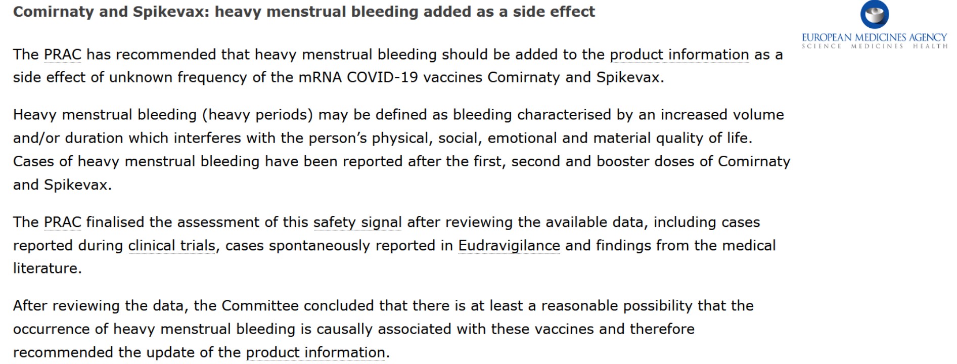 Il 28 ottobre 2022, l'EMA ha pubblicato una nuova guida in cui ha affermato che "il sanguinamento mestruale abbondante dovrebbe essere aggiunto alle informazioni sul prodotto come effetto collaterale di frequenza sconosciuta dei vaccini mRNA COVID-19 Comirnaty (Pfizer) e Spikevax (Moderna)". Il sanguinamento mestruale abbondante, continua sempre l'Agenzia europea del farmaco, può essere definito come "sanguinamento caratterizzato da un aumento del volume e/o della durata che interferisce con la qualità della vita fisica, sociale, emotiva e materiale della persona".