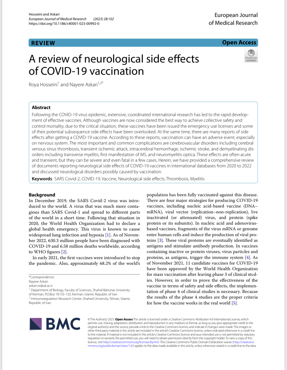 Uno studio condotto dai biologi Roya Hosseini e Nayere Askari e pubblicato su BioMed Central pone l'accento sullo sviluppo di reazioni avverse da vaccino Covid. Lo studio riporta come "in seguito all'epidemia del virus COVID-19, una ricerca internazionale ampia e coordinata ha portato al rapido sviluppo di vaccini. Sebbene i vaccini siano ora considerati il modo migliore per raggiungere la sicurezza collettiva e controllare la mortalità, a causa della situazione critica, a questi vaccini sono state rilasciate le licenze per l'uso di emergenza e alcuni dei loro potenziali effetti collaterali secondari sono stati trascurati".