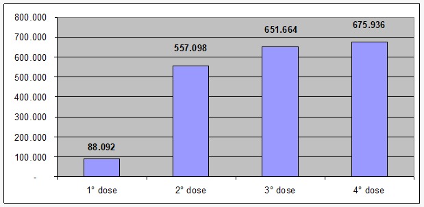 Decessi tra gli inoculati con vaccino Covid, così divisi per numero di dosi, tralasciando la durata del periodo tra l'ultima vaccinazione e la morte: