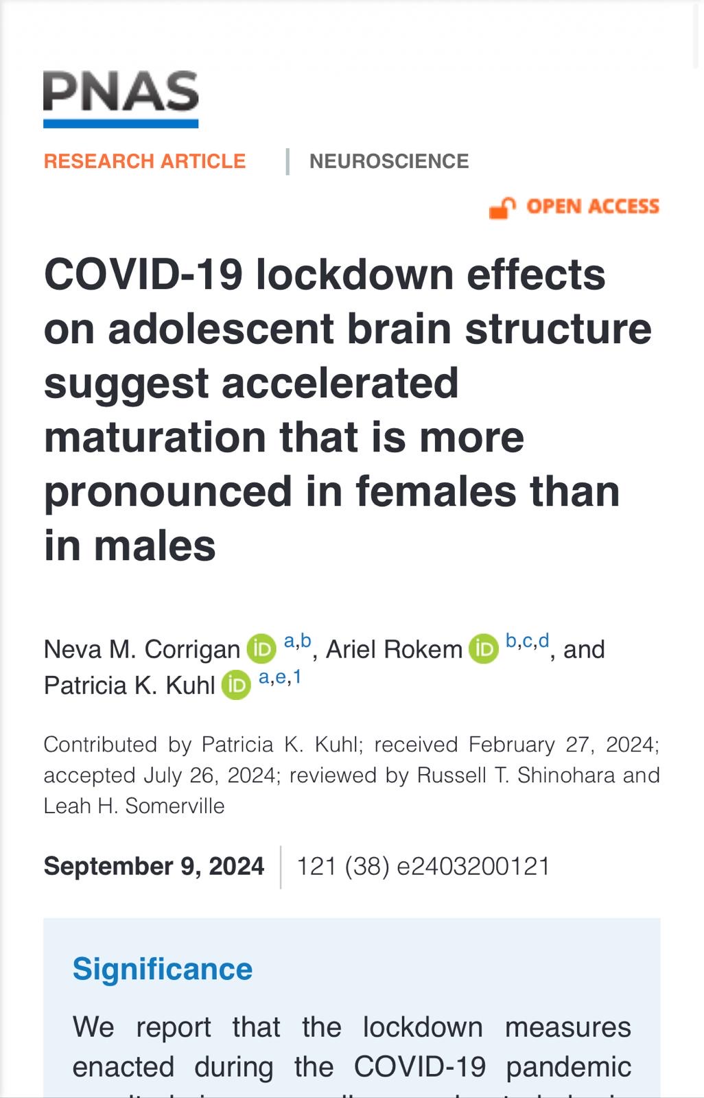Patricia Kuhl, autrice senior del lavoro, ha spiegato: "Pensiamo alla pandemia di Covid-19 come a una crisi sanitaria, ma sappiamo che ha causato altri profondi cambiamenti nelle nostre vite, soprattutto per gli adolescenti". Il confinamento è stato devastante per il cervello dei più giovani, costretti a restare chiusi in casa senza la possibilità di poter fare una passeggiata o vedere i loro amici. La loro corteccia cerebrale è risultata assottigliata a causa dei traumi, come è capitato per i veterani del Vietnam.