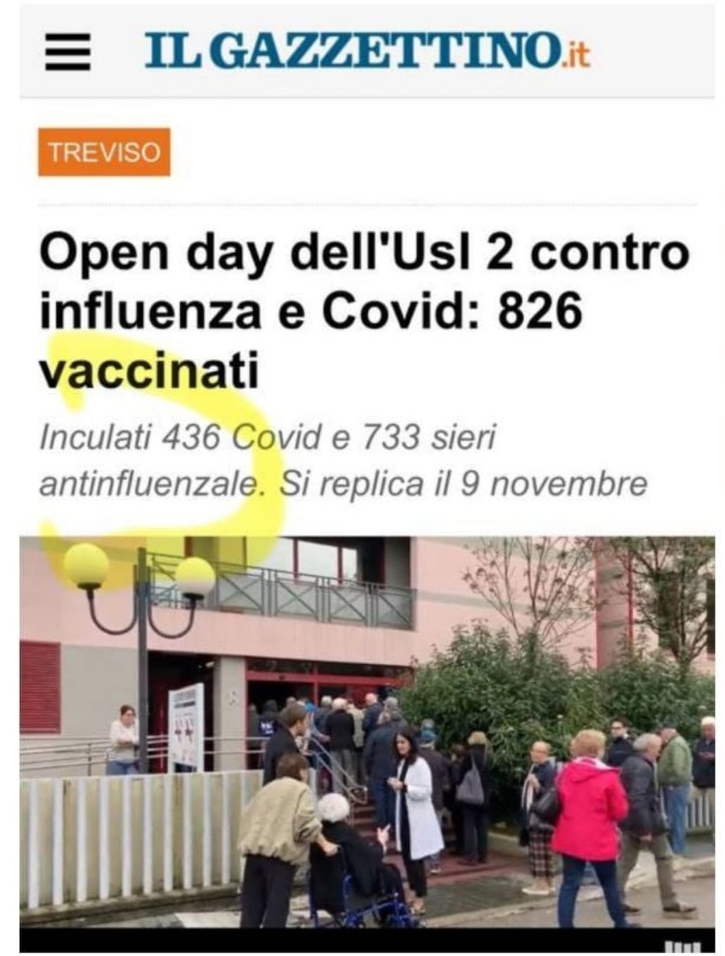 “Inculati 436 Covid e 733 sieri antifluenzali. Si replica il 9 novembre”, così Il Gazzettino ha scritto nel sottotitolo di un'articolo sull'Open Day Usl 2 contro influenza e Covid. Molti si stanno domandando se questa non sia una vera e propria “ammissione di verità” da parte di alcuni media sugli effetti avversi del vaccino Covid. Alcuni penseranno, invece, ad un piccolo errore di battitura per Il Gazzettino che, nel suo articolo, aveva pubblicato i dati inerenti all'ultima campagna vaccinale tenutasi a Treviso.