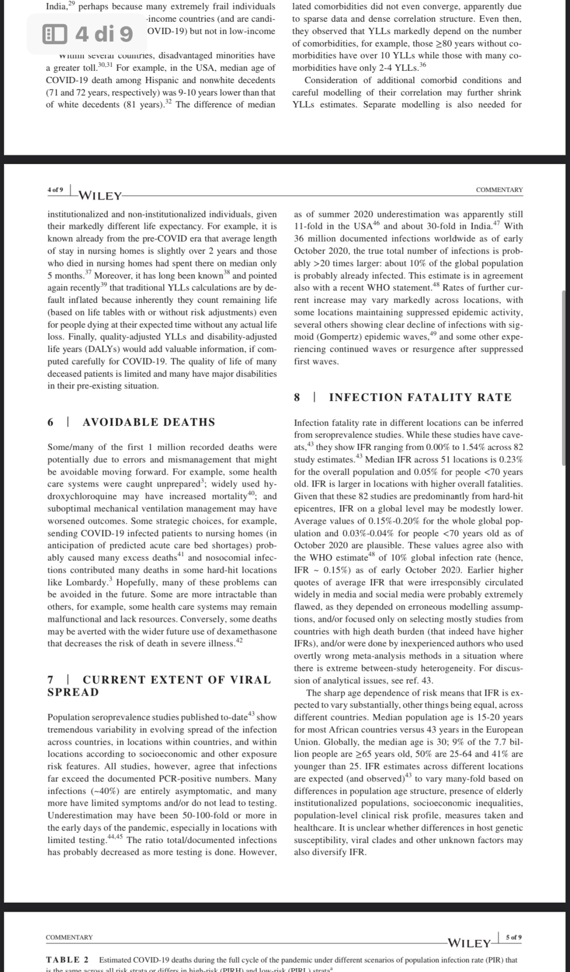 "Average values of 0.15%-0.20% for the whole global population and 0.03%-0.04% for people <70 years old as of October 2020 are plausible. These values agree also with the WHO estimate 48 of 10% global infection rate (hence, IFR ~ 0.15%) as of early October 2020. Earlier higher quotes of average IFR that were irresponsibly circulated widely in media and social media were probably extremely flawed, as they depended on erroneous modelling assumptions, and/or focused only on selecting mostly studies from countries with high death burden (that indeed have higher IFRs), and/or were done by inexperienced authors who used overtly wrong meta-analysis methods in a situation where there is extreme between-study heterogeneity. For discussion of analytical issues".