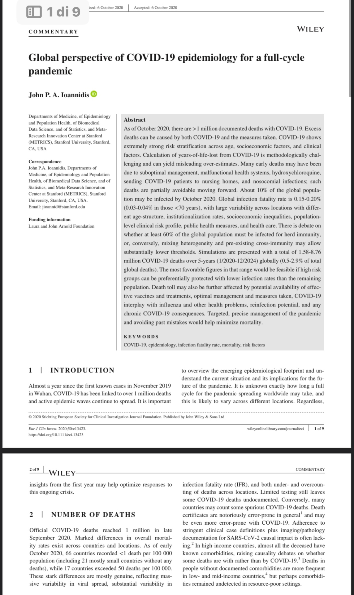 La stima del dottor Ioannidis, pubblicata dall'Organizzazione Mondiale della Sanità (Oms), è cinque volte inferiore alla sua precedente affermazione secondo cui l'IFR per tutte le fasce d'età era pari allo 0,25%. Per fare un paragone, l'influenza stagionale uccide circa lo 0,1% di tutti coloro che infetta.