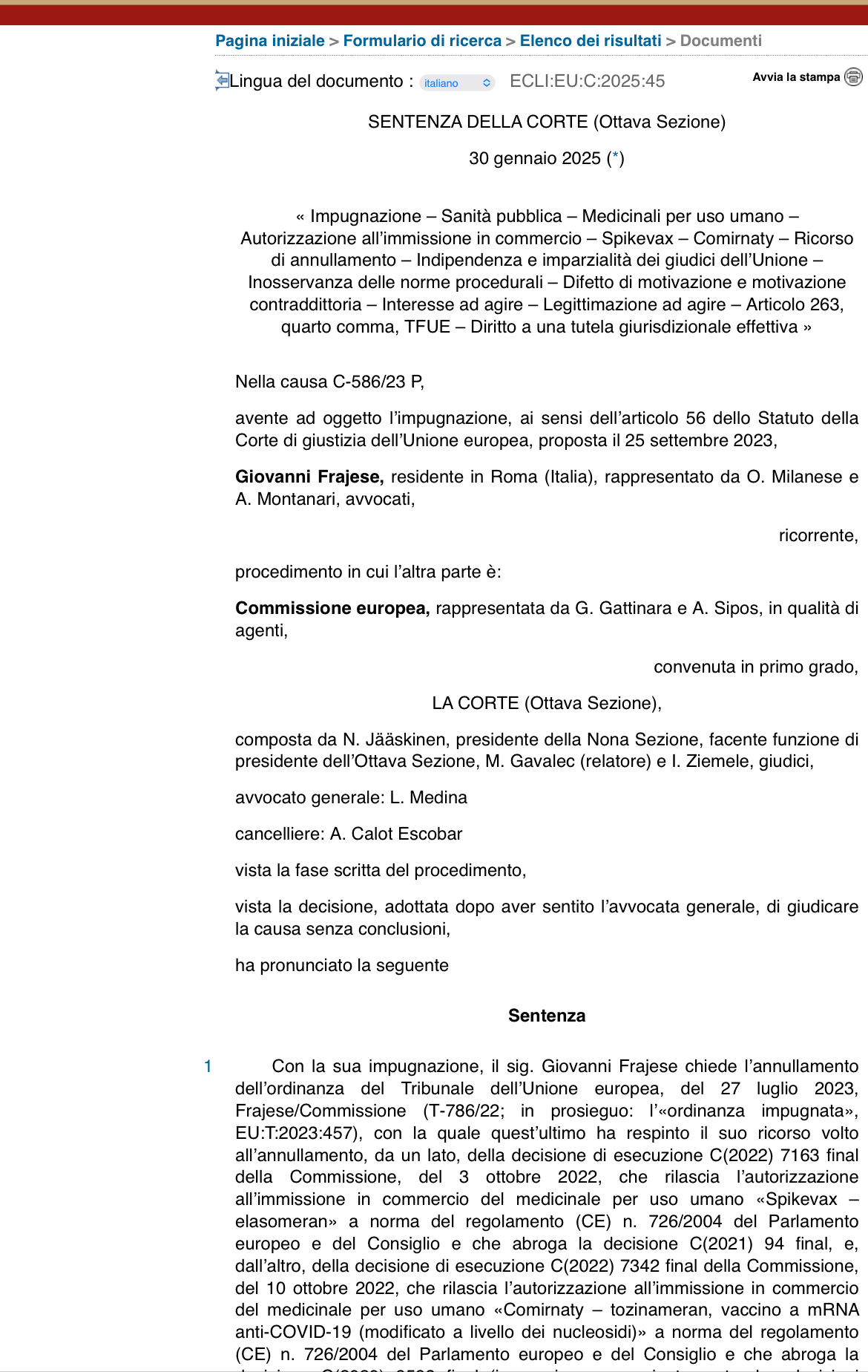 Tutto è partito da una richiesta dell'endocrinologo Giovanni Frajese, il quale aveva sollevato alcune irregolarità da parte della Commissione europea nella procedura di autorizzazione dei vaccini Covid a mRNA Pfizer e Moderna. Nonostante i giudici europei abbiano rigettato il ricorso e condannato Frajese al pagamento delle spese legali, la sentenza ha dato delle risposte importanti in tema di obbligatorietà del vaccino.
