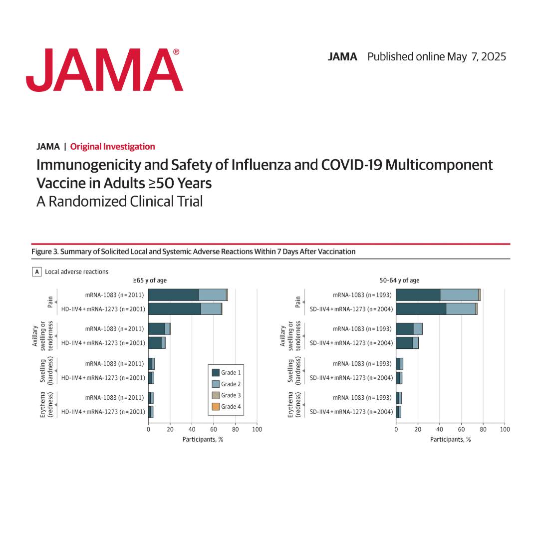 "In questo studio di fase 3, mRNA-1083 ha suscitato risposte immunitarie non inferiori contro la vaccinazione standard: vaccino antinfluenzale stagionale autorizzato a dose standard o ad alto dosaggio (A/H1N1, A/H3N2, B/Victoria, B/Yamagata) co-somministrato con il vaccino SARS-CoV-2 autorizzato (Omicron XBB.1.5). Il vaccino multicomponente mRNA-1083 ha mostrato un profilo di tollerabilità e sicurezza accettabile".