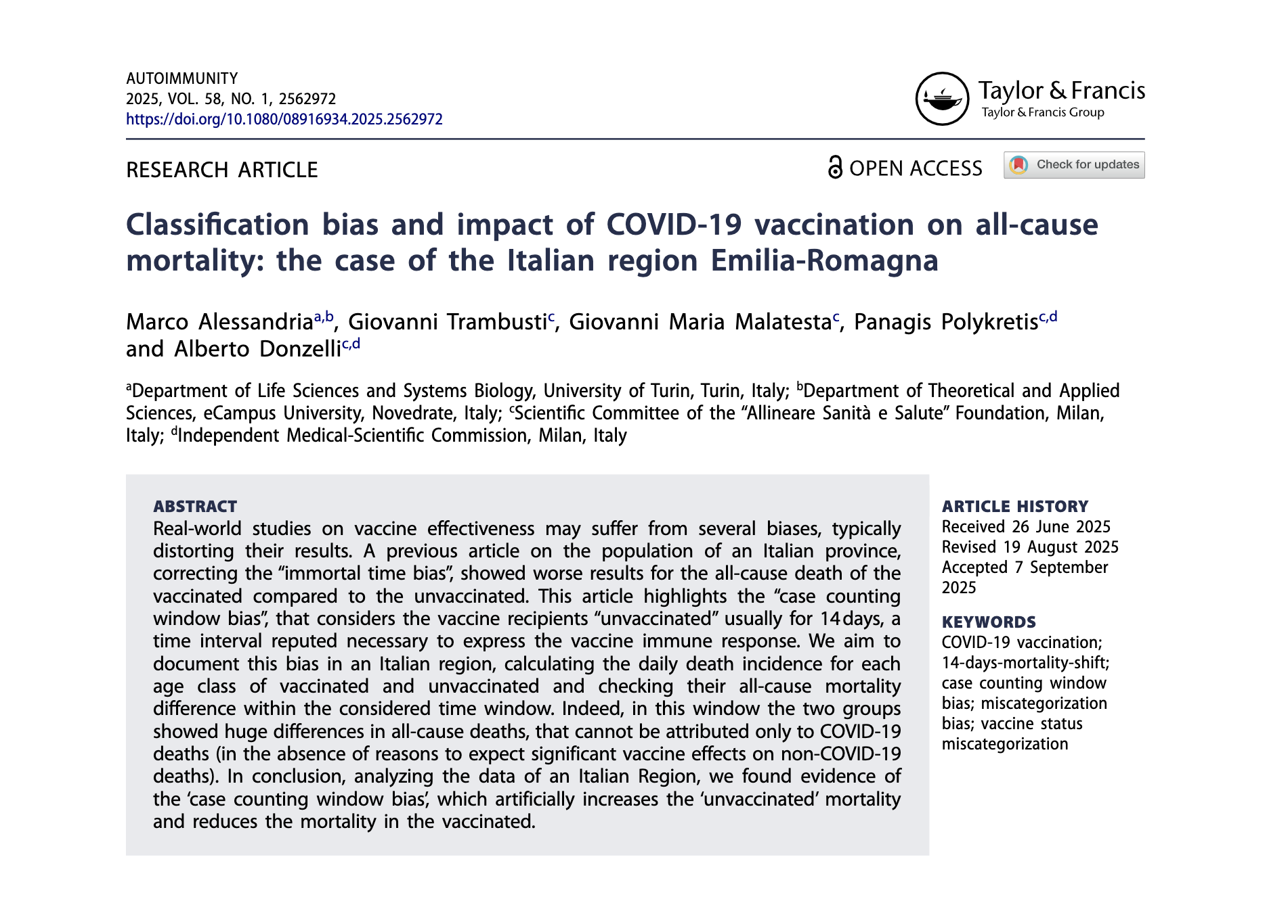 Lo studio – titolato Classification bias and impact of COVID-19 vaccination on all-cause mortality – analizza i dati ufficiali dell’Emilia-Romagna tra dicembre 2020 e dicembre 2021, ottenuti tramite accesso agli atti. Gli autori parlano apertamente di classification bias, definendolo una distorsione sistematica prodotta dalla cosiddetta counting window, la finestra di conteggio che attribuisce i soggetti alla categoria dei non vaccinati per i 14 giorni successivi all’inoculazione. Un’impostazione che non trova senso logico nel valutare la risposta immunitaria e che avrebbe così corrotto l'analisi e il conteggio degli eventi avversi immediati, inclusa la mortalità. Secondo gli autori, incrociando le curve di mortalità generale con quelle delle somministrazioni, emerge una correlazione statisticamente significativa: nei periodi di massima campagna vaccinale, i decessi – registrati nella categoria dei “non vaccinati” – aumentavano proprio nei 14 giorni post inoculazione.