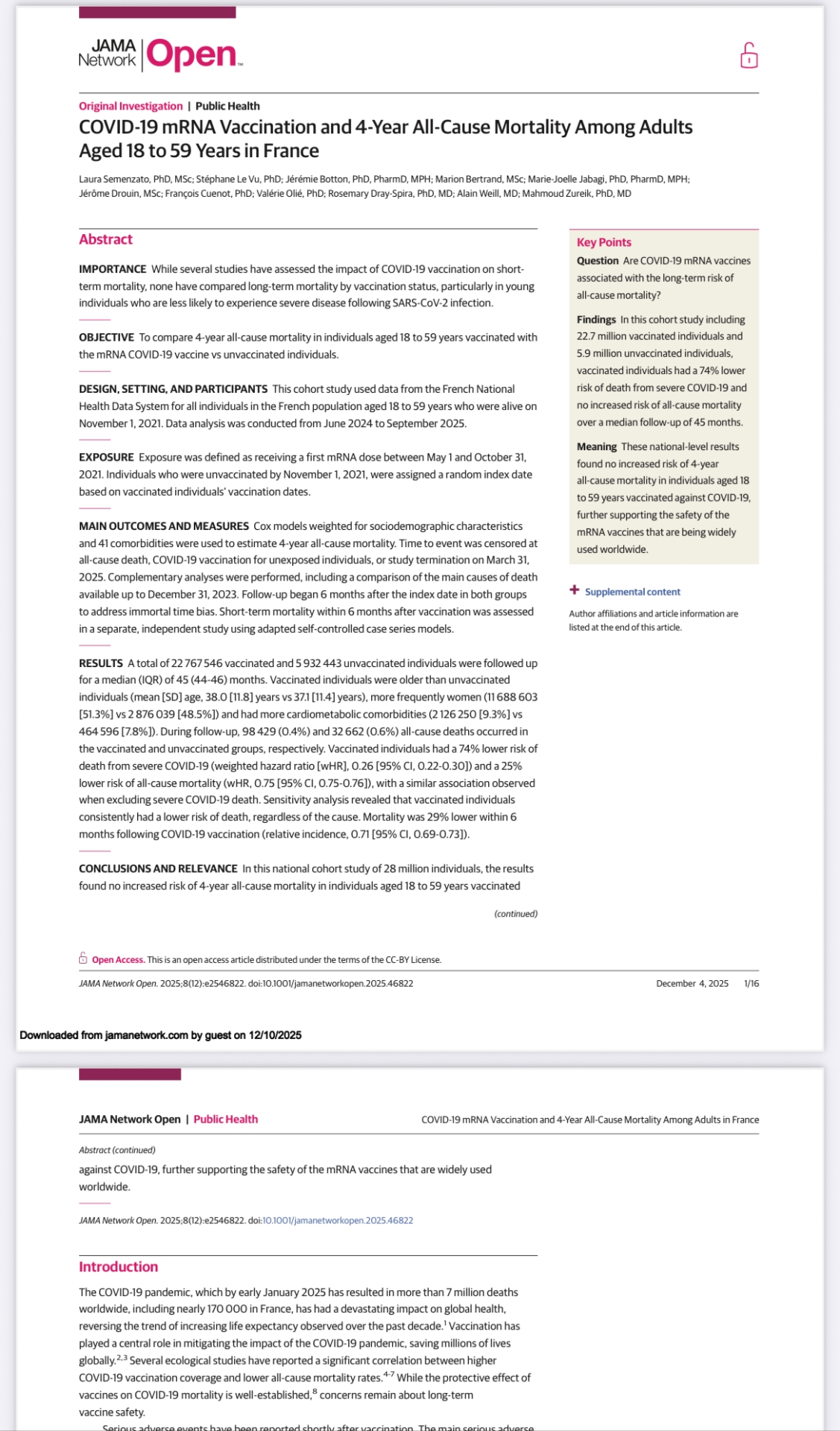 La ricerca si è basata sulle informazioni sanitarie di 28 milioni di individui residenti in Francia al 1° novembre 2021. Lo studio è stato condotto su 29 milioni di persone, di età compresa tra i 18 e i 59 anni. 23 milioni di questi aveva ricevuto almeno una dose di vaccino Covid a mRNA tra maggio e novembre 2021, 6 milioni erano soggetti non vaccinati. All'interno del gruppo vaccinato, lo 0,4% di persone sarebbero morte nei 4 anni seguenti la somministrazione del primo vaccino. Tra i non vaccinati, la cifra arriverebbe allo 0,6%, una mortalità generale superiore di un quarto.