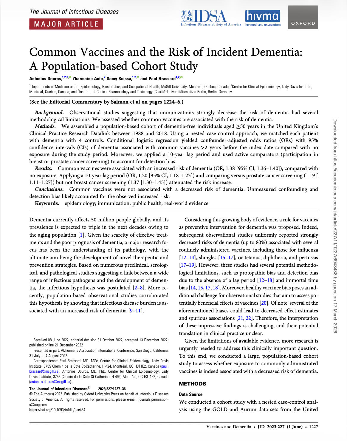 Il più ampio e approfondito studio finora condotto sulla relazione esistente tra alcuni vaccini comuni e il rischio di demenza, realizzato nel Regno Unito tra il 1988 e il 2018 con il coinvolgimento di 13,3 milioni di adulti di età pari o superiore ai 50 anni privi di demenza, ha evidenziato i seguenti risultati: gli adulti vaccinati con i vaccini coinvolti nello studio presenterebbero un rischio significativamente maggiore di sviluppare effetti avversi legati all'infermità mentale anche dopo 10 anni dall'inoculazione. La probabilità di contrarre una forma di demenza è maggiore del 38%, e aumenta fino al 50% nel caso specifico del morbo di Alzheimer.