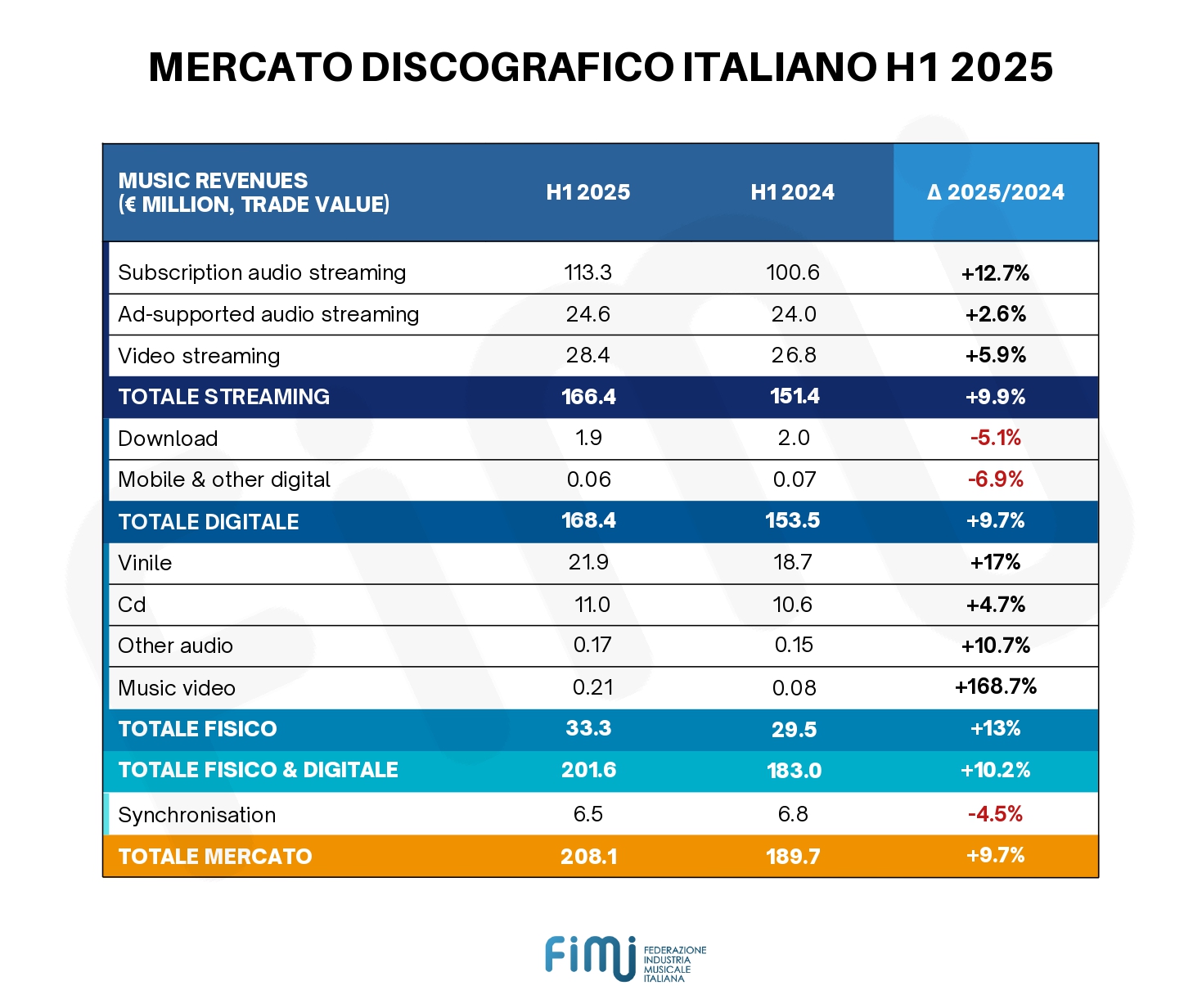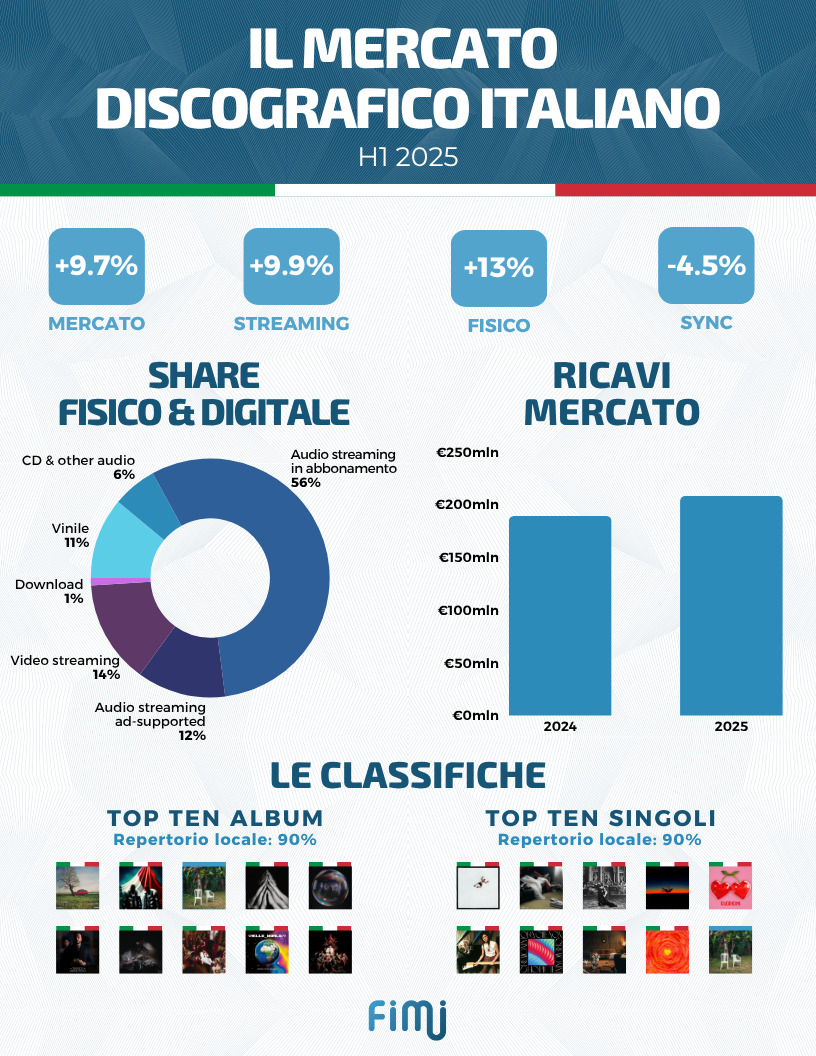 E il mercato musicale italiano, intanto, continua a crescere anche nel primo semestre del 2025: come ha appena comunicato la Fimi, Federazione industria musicale italiana, tra gennaio e giugno il fatturato supera i 208 milioni di euro, con un + 9,7% sullo stesso periodo del 2024 grazie a un aumento dei ricavi di quasi tutti i comparti. “Lo streaming segna una crescita del 9,9%, e in particolare si registra un’ottima performance del segmento premium(+ 12,7%), ovvero quello in abbonamento, con 113 milioni di euro di fatturato e una quota di mercato pari al 56% della share tra fisico e digitale. Ma è il comparto fisico a registrare la crescita migliore: si tratta infatti di un importante + 13%, in un contesto in cui crescono sia il vinile (+ 17%) sia i cd (+ 4,7%). Si conferma, infine, il consolidato dominio del repertorio italiano con entrambe le Top10 Album e Singoli occupate al 90% da titoli locali”, commentano da Fimi.
