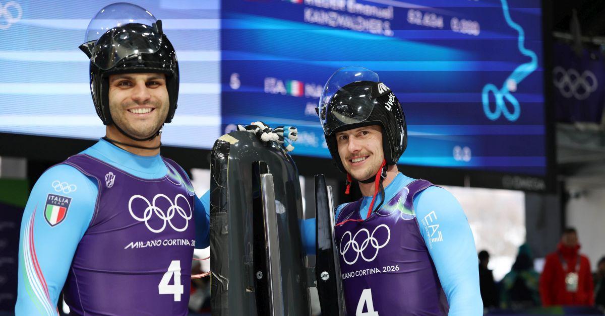 Terzi dopo la prima run, i due azzurri vanno a prendersi il primo gradino del podio CORTINA - Arriva un altro clamoroso oro per l'Italia dallo slittino ai Giochi Invernali di Milano-Cortina. Sulla nuova pista Monti Emanuel Rieder e Simon Kainzwalder imitano a distanza di un'ora le colleghe Andrea Voetter e Marion Oberhofer e vanno a prendersi il titolo olimpico nel doppio maschile con un'incredibile rimonta. Terzi infatti dopo la prima run, i due azzurri finiscono davanti a tutti col tempo complessivo di 1'45"086, beffando di 68 millesimi gli austriaci Thomas Steu e Wolfgang Kindl, argento, mentre chiudono terzi i tedeschi Tobias Wendl e Tobias Artl, bronzo a 0"090 dal tandem tricolore. Per l'Italia è il quarto oro a questi Giochi. - foto Ipa Agency - . glb/red 11-Feb-26 20:32