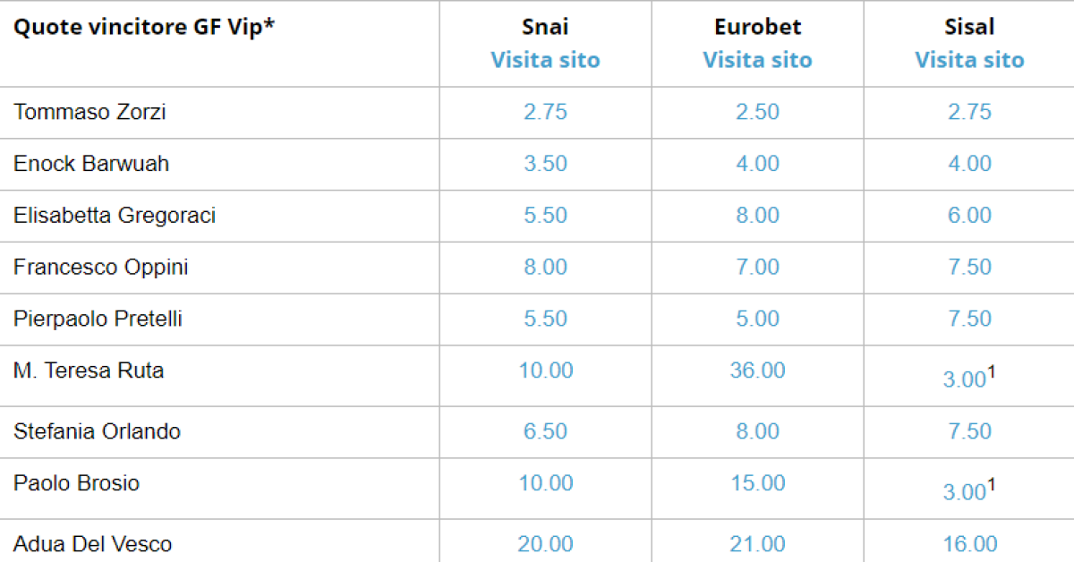 1 Le quote Paolo Brosio, Maria Teresa Ruta, Stefano Bettarini e Giulia Salemi Vincente Gf Vip vincente sono presenti alla voce "Altro" su Sisal Matchpoint