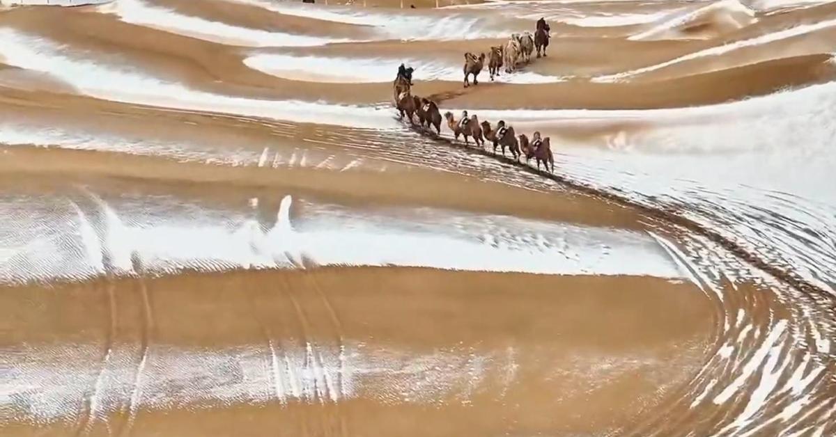 Una veduta aerea del deserto Xiangshawan a Ordos, nella Mongolia Interna cinese. Quando i fiocchi di neve scendono dolcemente e il vento spazza le dune, questa regione selvaggia assume un aspetto nuovo e sorprendente. (XINHUA)