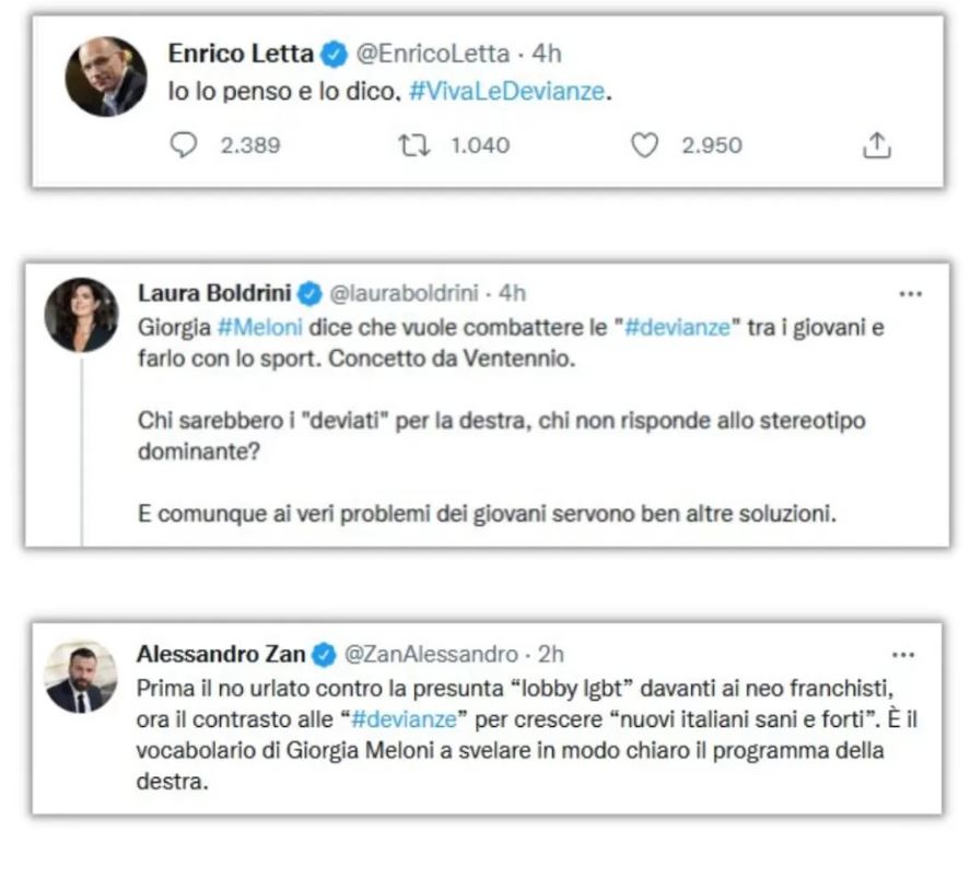 Il riferimento di Frajese era a un tweet di Enrico Letta. "Io lo penso e lo dico. #VivaLeDevianze", aveva scritto il segretario del Pd. Letta era stato seguito subito a ruota da molti esponenti del suo partito, tra cui Laura Boldrini e Alessandro Zan.