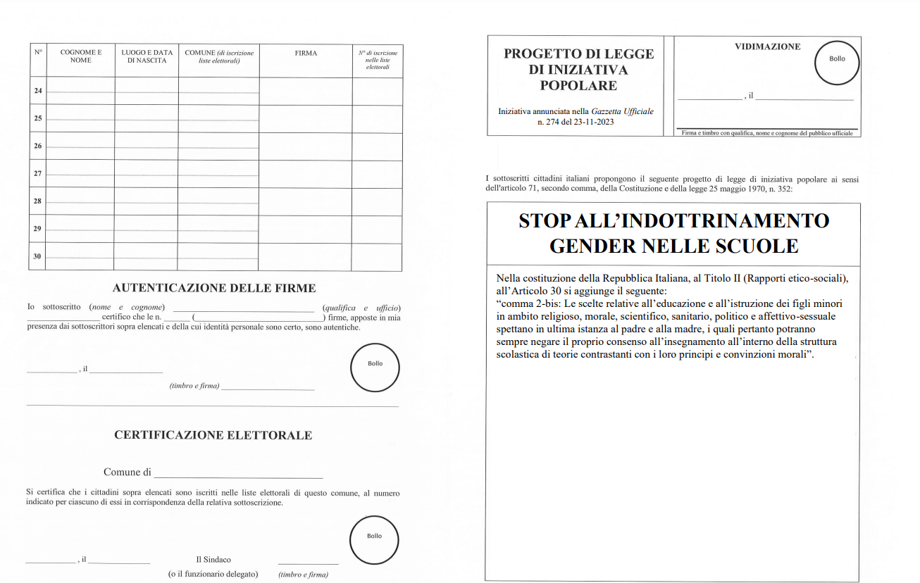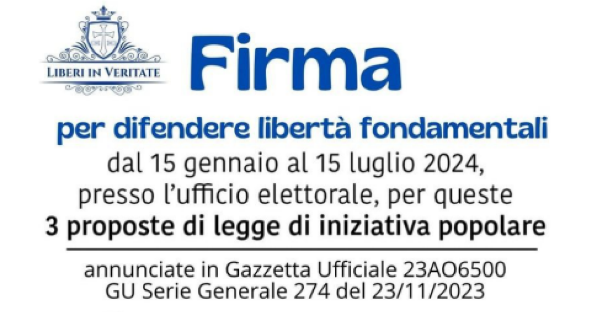 "Firma per difendere libertà fondamentali", si legge nella locandina di Liberi in Veritate, alleanza anti globalista per la difesa dell'ordine del creato e protagonista delle tre proposte di legge del referendum di iniziativa popolare. Proposte che prevedono il "diritto all'autoproduzione del cibo", "diritto alla libertà di pagamento in contanti" e lo "stop all'indottrinamento gender nelle scuole". Sarà possibile firmare e aderire al referendum fino al 15 luglio 2024 negli uffici elettorali dei propri comuni di residenza.