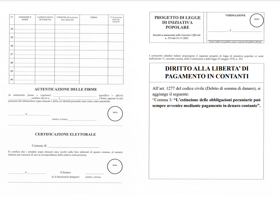 "Noi promuoviamo tutto quello che può essere in contrasto con l'agenda globalista e in difesa del diritto naturale", dice Davide Lovat di Liberi in Veritate. "La prima proposta di legge riguarda il diritto alla libertà di pagamento in contanti: chiediamo che venga sancito il diritto di poter pagare qualsiasi prestazione economica in contanti, senza nulla togliere a quelli elettronici sia chiaro. Con i contanti, però, siamo liberi. Abbiamo conosciuto uno strumento satanico come il green pass, il quale, se dovesse essere collegato alla moneta digitale, potrebbe stoppare l'utilizzo di carte di credito e conti corrente. L'iniziativa richiede 50mila firme in 6 mesi".