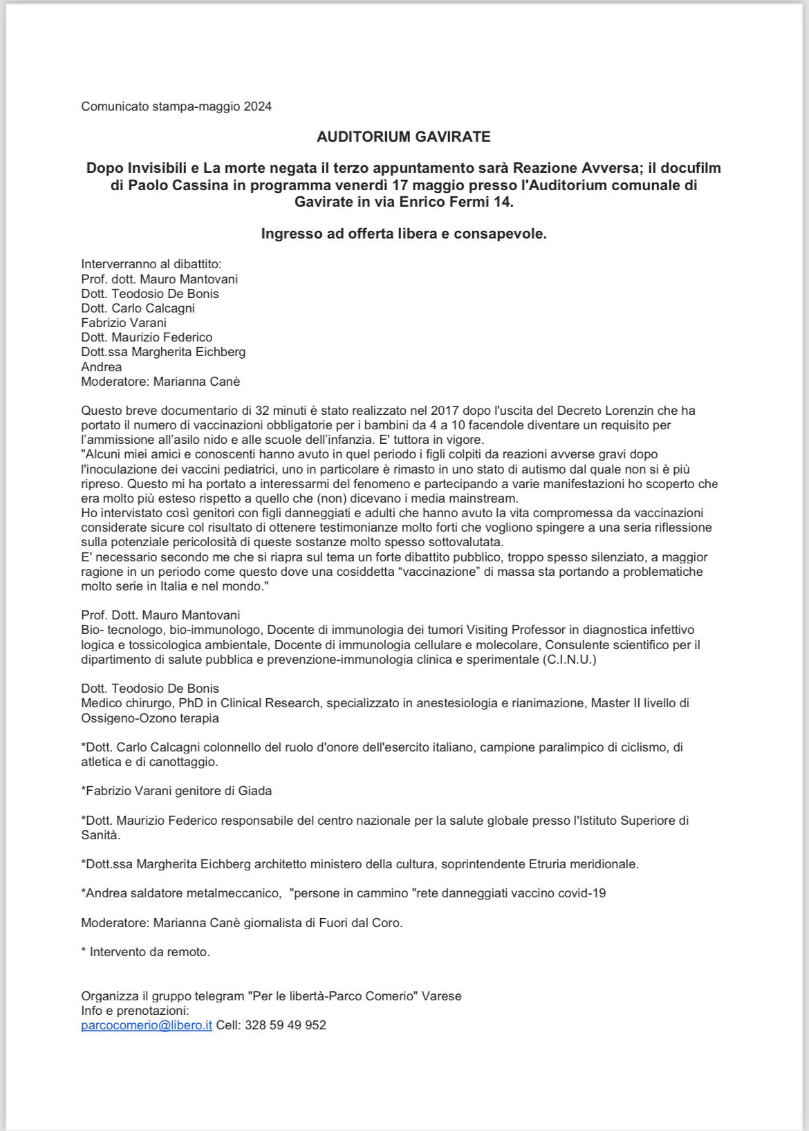 Dopo Invisibili e La morte negata il terzo appuntamento sarà Reazione Avversa; il docufilm di Paolo Cassina in programma venerdì 17 maggio presso l'Auditorium comunale di Gavirate in via Enrico Fermi 14. Ingresso ad offerta libera e consapevole.