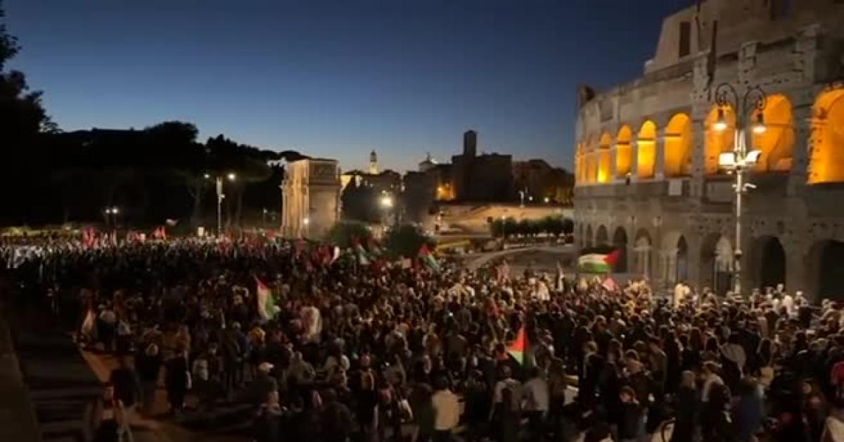 Tante le bandiere palestinesi, la manifestazione, anche in segno di solidarietà per le nuovi navi della Flotilla intercettate da Israele, è stata promossa tra gli altri dal Movimento Studenti Palestinesi in Italia, dalla Comunità Palestinese in Italia, da UDAP, Associazione dei Palestinesi in Italia e Giovani Palestinesi in Italia.