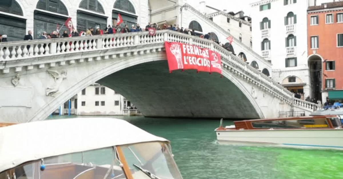 Le immagini mostrano il Canal Grande tinto di verde, striscioni "Fermare l'ecocidio" sul Ponte di Rialto e cortei di attivisti vestiti di rosso che attraversano la folla dei turisti.