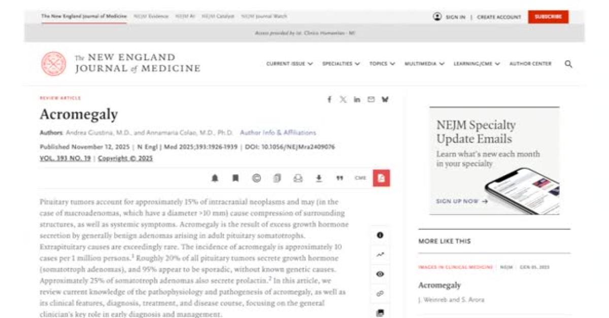 Milano, 25 nov. (askanews) - Quando una malattia è così subdola da confondersi con i normali segni del tempo, il rischio è che passi inosservata per anni. È il caso dell'acromegalia, una patologia rara causata da un tumore ipofisario che produce un eccesso di ormone della crescita, che colpisce soprattutto adulti tra i 30 e i 60 anni e che può alterare profondamente i tratti del volto, delle mani e dei piedi. Una condizione sulla quale ha puntato i riflettori internazionali il New England Journal of Medicine pubblicando un articolo firmato da Andrea Giustina del San Raffaele di Milano a Annamaria Colao della "Federico II" di Napoli, che certifica la centralità dell'Italia nella ricerca e gestione di questa patologia.