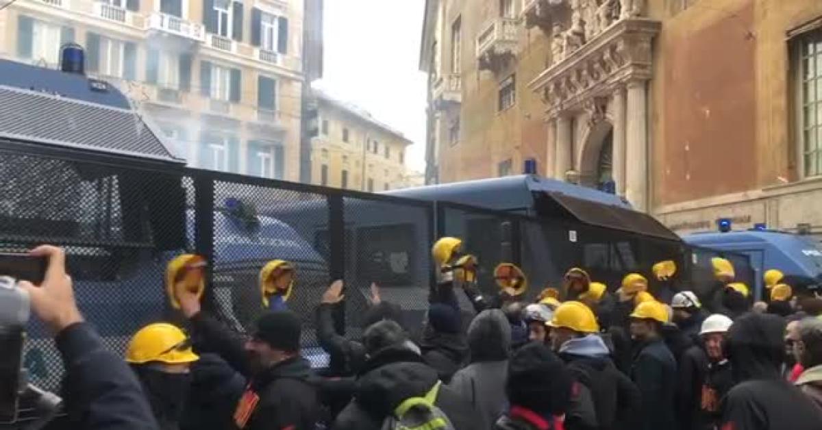 Genova, 4 dic. (askanews) - Momenti di tensione davanti alla prefettura di Genova all'arrivo del corteo degli operai dello stabilimento ex Ilva di Cornigliano. I manifestanti hanno trovato la strada chiusa da alcuni alari della polizia e hanno iniziato a battere contro le griglie metalliche con i caschi da lavoro lanciando fumogeni, petardi e uova verso le forze dell'ordine. La polizia ha risposto con un fitto lancio di lacrimogeni. In piazza anche una pala meccanica e altri mezzi da lavoro. I lavoratori dello stabilimento ex Ilva da lunedì sono in sciopero per chiedere il ritiro del piano a ciclo corto.