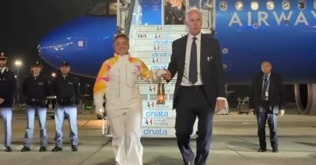 Roma, 4 dic. (askanews) - La fiamma olimpica di Milano-Cortina è atterrata a Fiumicino e torna così in Italia vent'anni dopo i Giochi invernali di Torino 2006. E' arrivata a Roma a bordo del volo Ita proveniente da Atene. A scendere con la fiamma l'olimpionica di tennis, Jasmine Paolini e il presidente della fondazione Milano Cortina, Giovanni Malagò.