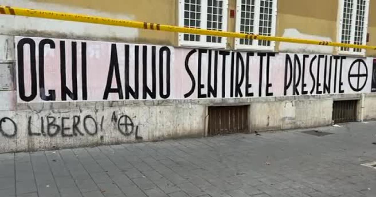 Sui muri circostanti due mega scritte: "Per tutti i camerata caduti" e "Ogni anno sentirete presente". In mattinata si è svolta la cerimonia con la deposizione di una corona di fiori con il presidente della Regione Lazio Francesco Rocca, il vicepresidente della Camera Fabio Rampelli e il deputato FdI e presidente della Commissione Cultura Federico Mollicone.