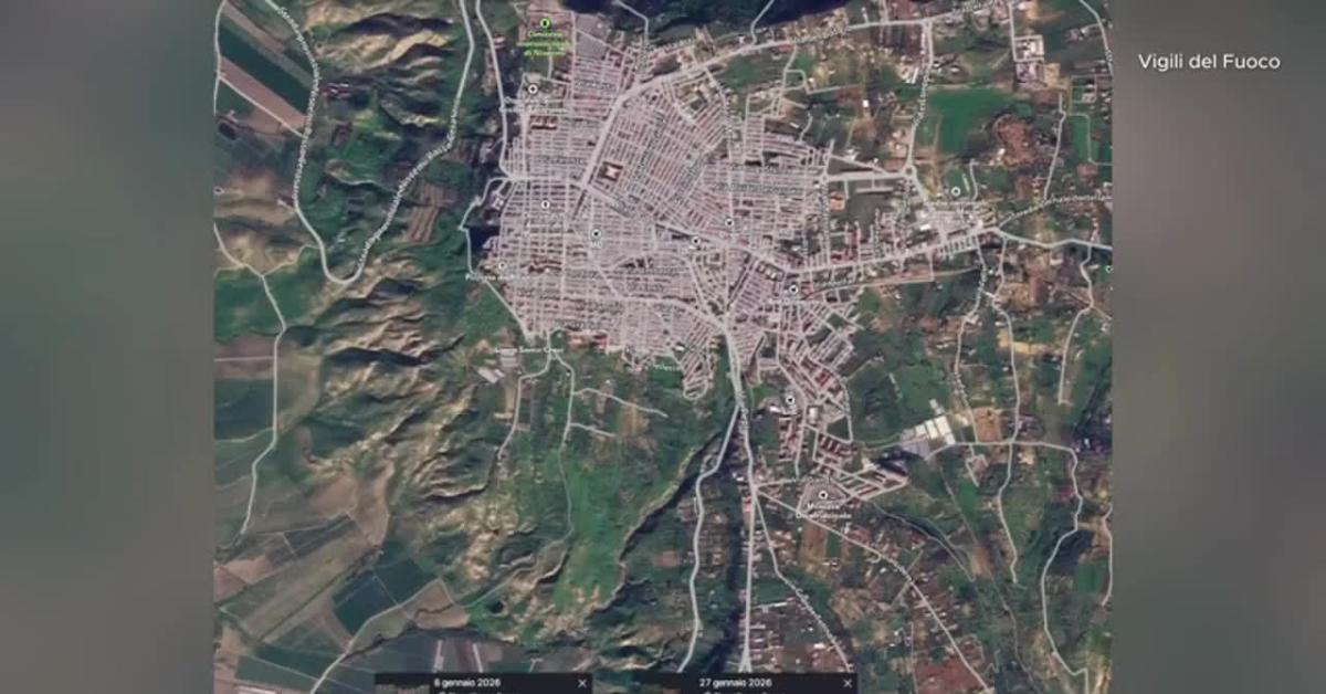 Le immagini satellitari acquisite prima e dopo la frana di Niscemi, analizzate dai topografi dei Vigili del Fuoco insieme alla società Vantor, documentano in modo chiaro lo spostamento del versante interessato dal dissesto.