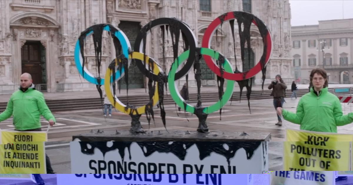 "Attiviste e attivisti di Greenpeace Italia hanno posizionato una grande installazione raffigurante i cinque Cerchi Olimpici che colano petrolio e la scritta 'Sponsored by Eni' in Piazza del Duomo a Milano, dove in serata è atteso l'arrivo della Fiamma Olimpica", ha spiegato l'associazione ambientalista.