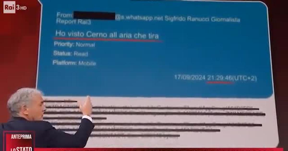 Il conduttore de Lo Stato delle Cose ha mostrato in diretta delle chat che vedono il coinvolgimento di Ranucci. Chat scambiate con Boccia dopo un incontro avvenuto il 17 settembre 2024. Alle 21:29 Boccia scrive a Ranucci: "Ho visto Cerno all'Aria che tira... è davvero scandaloso". Il conduttore di Report la avvisa: "Quello è un altro del giro... giro gay, pericolosissimo". E poi: "Amico di Marco Mancini, giro gay", facendo riferimento all'ex capo dei servizi segreti.