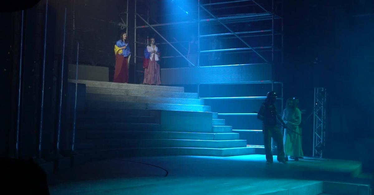 Il palcoscenico come un tempio, per cantare in una preghiera collettiva l'urgenza di una pace non più rinviabile, rinnovando l'attualità di una storia millenaria attraverso una gigantesca bandiera dai colori giallo e blu. La figura mitica di Gesù, ferita da 39 frustate inferte da Pilato a tempo di musica, mentre scorrono le immagini di martiri come monito di ogni tragedia, antica o contemporanea. E poi due artiste, una ucraina e una russa, in una struggente performance condivisa, ognuna avvolta nella bandiera del proprio Paese, eppure unite da un comune sentimento di perdono.