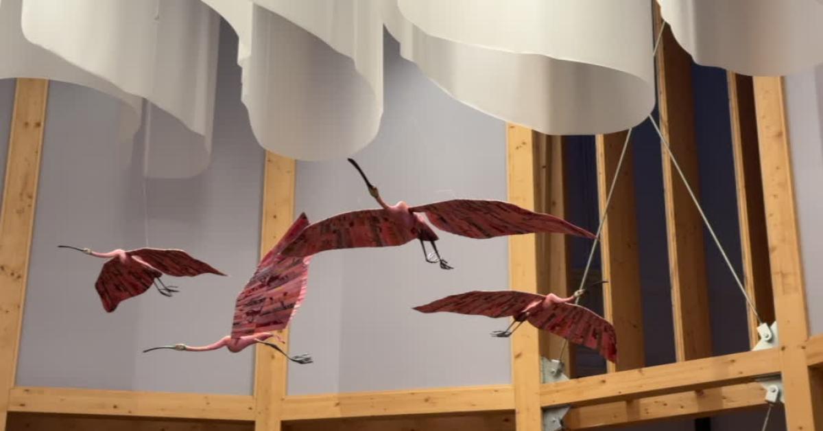 Il tema ambientale è da sempre al centro del lavoro di Alice Zanin. Andrea Dusio: "L'idea è un po' di dare un messaggio di sostenibilità, di economia circolare. Le opere di Alice sono prodotte seguendo un processo molto particolare di recupero della materia". E l'artista ha spiegato nello specifico il suo metodo di lavoro: "Sono tutti pezzi unici, come si vede girandoci sotto i pezzi sono tutti diversi l'uno dell'altro e sono tutti realizzati a partire da uno schizzo quotato. Dopodiché io vado a costruire un'armatura in ferro sopra la quale vado a modellare i volumi con la carta. La mia tecnica non è propriamente un papier-maché, recupera un po' la matrice europea, un po' quella orientale dei papier collets. Dopo hanno in questo caso una finitura impermeabilizzante, ma il materiale principale, cioè la carta, è tutta di riciclo. Il giochino interpretativo è che gli uccelli siano diventati rosa dopo aver mangiato dei dolci, delle caramelle rosa, ma nella realtà le spatole rosate sono davvero di questo rosa brillante, tanto è vero che ai primi del Novecento hanno rischiato l'estinzione perché venivano cacciati e le penne venivano utilizzate per realizzare ventagli e ornamenti per cappelli. Fondamentalmente inscenando un'installazione che richiama uno stormo di uccelli credo che di base l'emozione che si vorrebbe suscitare sia proprio quella dello stupore e quindi di richiamo lo stupore di fronte alla bellezza della natura".