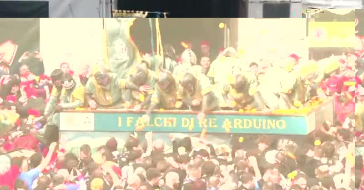 Ivrea, 16 feb. (askanews) - Le strade di Ivrea si animano di festa e si tingono di arancione per la storica Battaglia delle Arance. Divisi in squadre di quartiere, gli abitanti a piedi lanciano arance contro gli eserciti del tiranno appostati sui carri. Lo spettacolo rievoca la leggenda di Violetta, la figlia del mugnaio che sfida e uccide il tiranno per sfuggire alla sua rivendicazione del "diritto della prima notte", innescando una ribellione che ancora oggi riecheggia in città. La tradizione, secondo il 75enne Giuseppe Sado, riguarda "la rivoluzione del popolo". Gli abitanti di Ivrea e gli organizzatori respingono al mittente le critiche per "lo spreco di arance" chiarendo che si tratta di agrumi di scarto e non adatti alla vendita, che verrebbero buttati via. Non c'è comunque spreco perché, alla fine dalla giornata, quel che resta delle arance viene raccolto e usato per fare compost biologico per l'agricoltura.