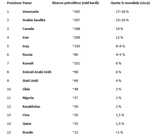 Tra questi, il Venezuela emerge in cima alla classifica mondiale, con riserve provate di petrolio nettamente superiori a quelle di Arabia Saudita, Canada, Iran e Iraq, e pari a una quota significativa delle riserve globali totali.