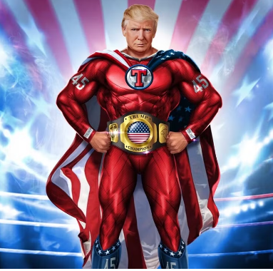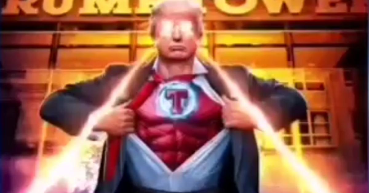 Davanti alla TrumpTower, Trump in versione supereroe con tanto di mantello e laser dagli occhi invita a collezionare queste immagini di "arte incredibile, ritraenti la mia vita e la mia carriera che sono state emozionanti."