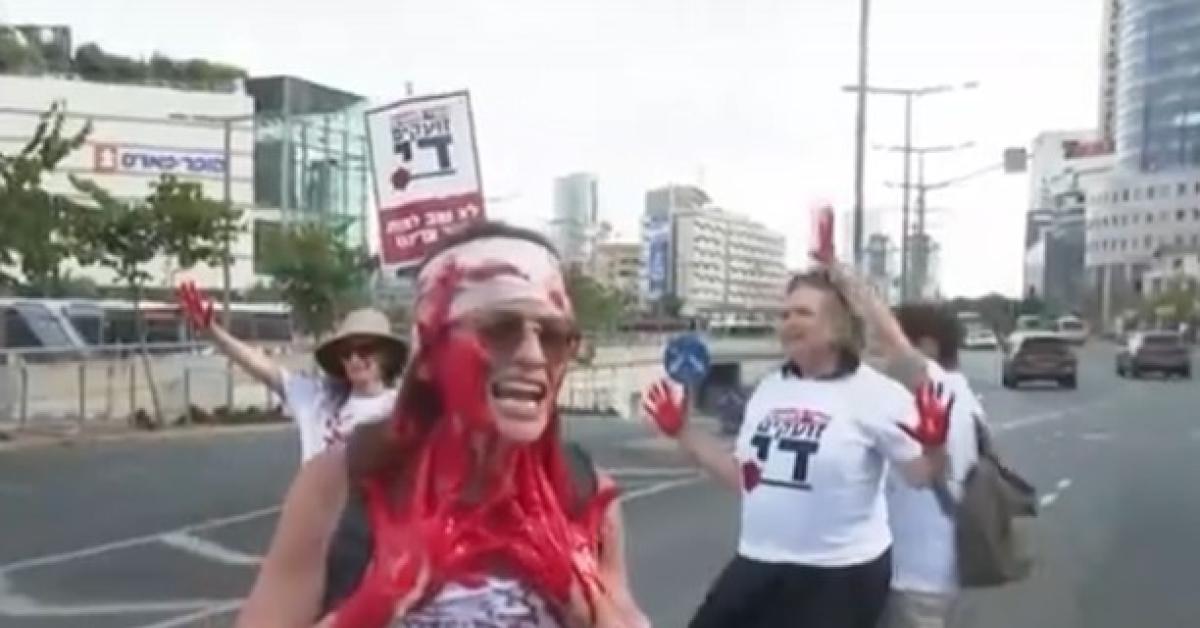 Con mani e visi macchiati di rosso, come se fossero sporche di sangue, le madri dei soldati israeliani al fronte per combattere la guerra contro Gaza protestano contro il governo di Natanyahu. Le donne bloccano le strade gridando al megafono frasi di dissenso.
