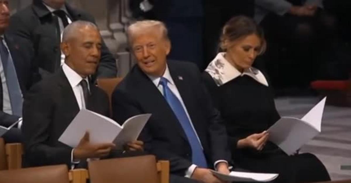 Al funerale di Jimmy Carter nella National Cathedral di Washington l'ex presidente Barack Obama e il presidente-eletto Donald Trump hanno chiacchierato a lungo, seduti uno accanto all'altro. E a un certo punto Obama, ascoltando il presidente eletto, si è messo a ridere. L'immagine è subito finita in mondovisione e poi sui social, dove gli utenti si chiedono cosa mai abbia sussurrato Trump al suo predecessore per farlo ridere. I due, agli antipodi politicamente, hanno conversato a lungo e dalle immagini in modo molto affabile: anche Trump a tratti ha sorriso e accennato a delle risa, fatto abbastanza raro per il presidente repubblicano. Kamala Harris li ha guardati tirando un sospiro. La sua reazione è già diventata un meme. Le esequie di Carter hanno riunito i cinque presidenti degli Stati Uniti oggi in vita: Bill Clinton, George W. Bush e Joe Biden, oltre a Obama e Trump.