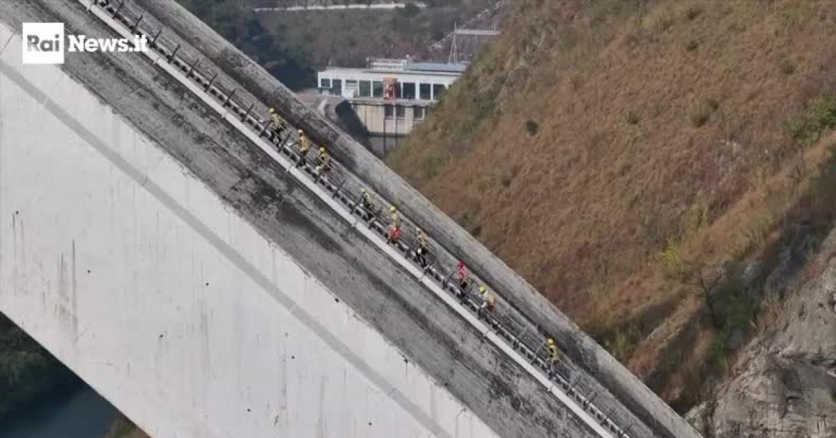Per arrivare all'interno dei vani da controllare, il team di operai e professionisti si deve issare lungo una scala che sempre sospesa nel nulla. Il Beipanjiang è lungo 1341 metri.