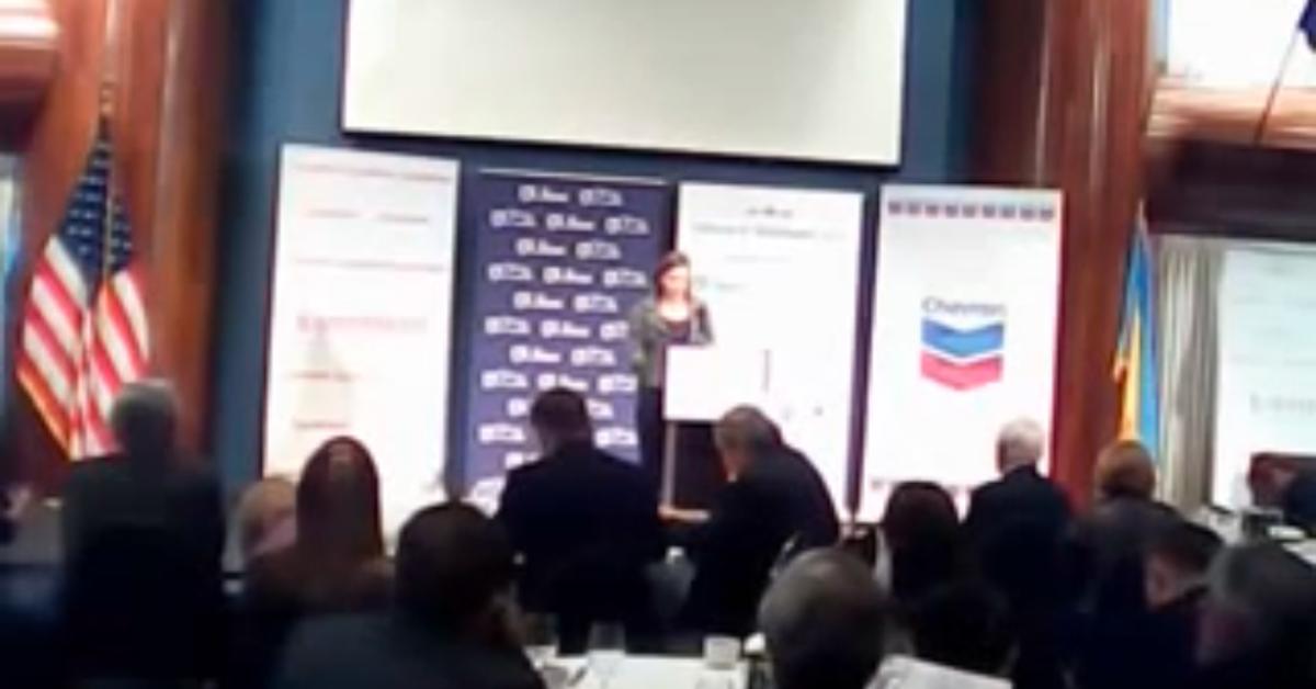 L'intervento di Victoria Nuland viene introdotto: "Signore e signori, ho il grande onore e piacere di presentarvi l'Assistente del Segretario di Stato per gli Affari europei ed eurasiatici, Victoria Nuland. Victoria è da poco tornata da Kiev e ci aggiorna sulla situazione in loco e sulla posizione del governo statunitense".