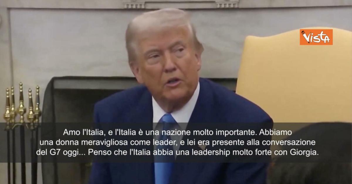 Trump ha continuato: "Amo l'Italia, e l'Italia è una nazione molto importante. Abbiamo una donna meravigliosa come leader, e lei era presente alla conversazione del G7 oggi... Penso che l'Italia abbia una leadership molto forte con Giorgia".